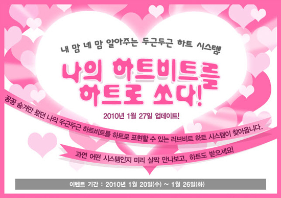 `러브비트`가 유저들이 하트를 통해 더욱 자유롭게 자신의 마음을 표현할 수 있는 ‘하트시스템’ 업데이트를 앞두고 이벤트를 진행한다. ‘하트 시스템` 도입으로 러브비트 게임 내에서 만나는 유저들은 서로 더욱 적극적이고 자유로운..