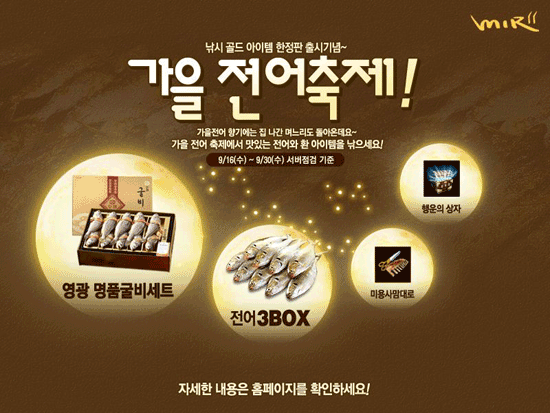 위메이드 엔터테인먼트가 개발, 서비스하고 있는 무협MMORPG 게임 `미르의 전설2`가 16일, 낚시 이벤트 가을전어 축제를 실시한다.