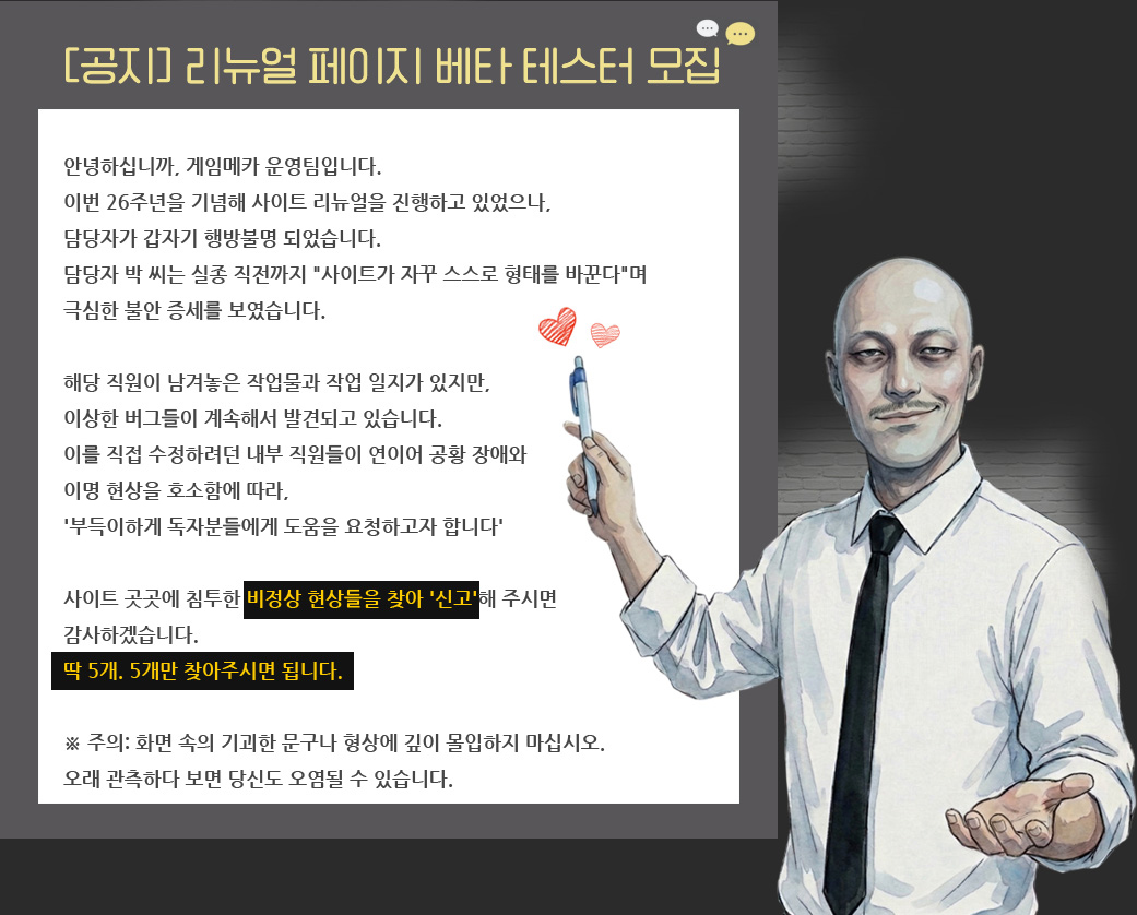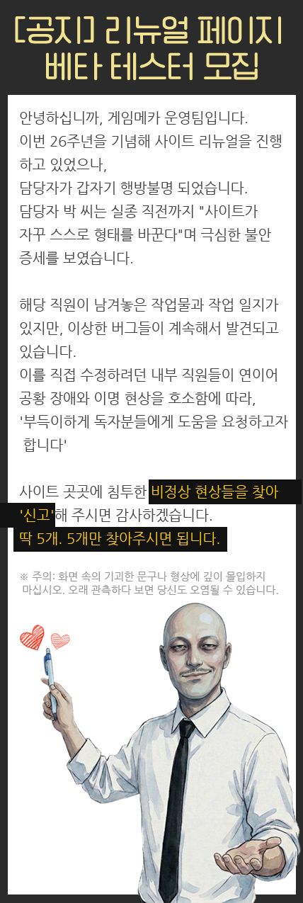 • 게임메카 홈페이지 리뉴얼 이벤트는 이상현상을 찾는 이벤트입니다.