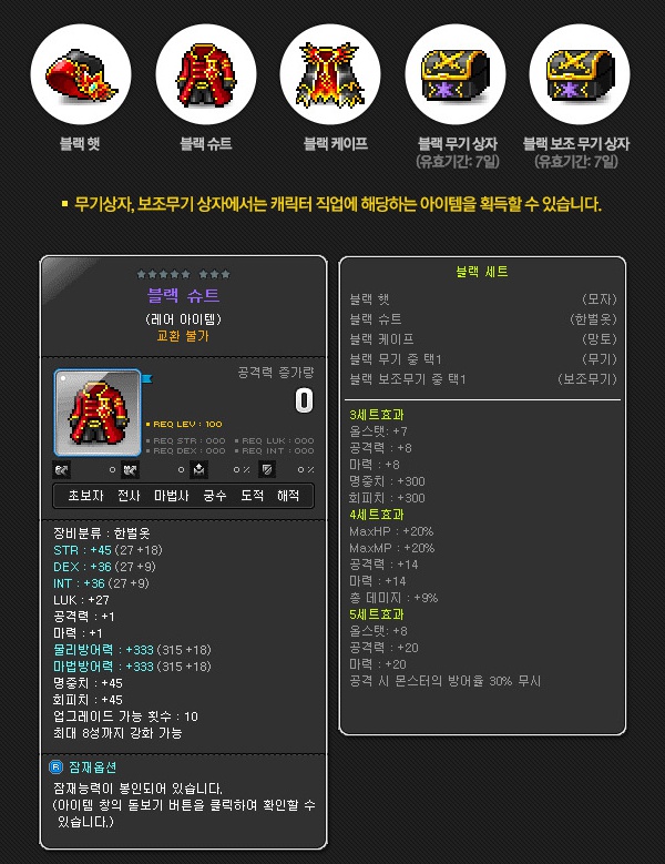 예전에 메이플 10주년 이벤트때 마련 못하신분들은 지금이라도버닝캐릭터 설정 후 퀘스트를통해서 수령하시는 것도 좋을것 같음예전에 나온 에픽아이템 10주년 블랙 슈트보다 한층 업그레이드 된 레어템이니한번 이번참에 마련해 보시는것도 기회일듯.하아 아직도 블랙헤븐의 감성에서 헤어나오질 못하껫엉..
