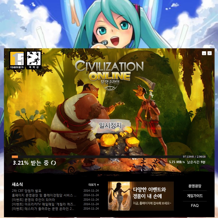 당첨자 확인하고 초대권 Get 했습니다.뭐 2차 CBT 기간중에 CBT 신청이 가능하다니깐 지금이라도 신청해보심이 ^^ ㅋㅋ당장 내일부터 CBT 인지라 서버폭주를 예상해 미리 클라이언트를 깔고있죠..저의 배경화면의 미쿠짱도 환하게 웃고있군요^^내일 아즈텍 공개되니 아즈텍부터 열심히 공략해보렵니다.문명 2차 CBT 이벤트도 상당히 푸짐하게 하고있던데궁금하신분은 공식 홈페이지 새소식에서 이벤트소식 참고하시길^^문명온라인 바로가기 > http://civ.xlgames.com/
