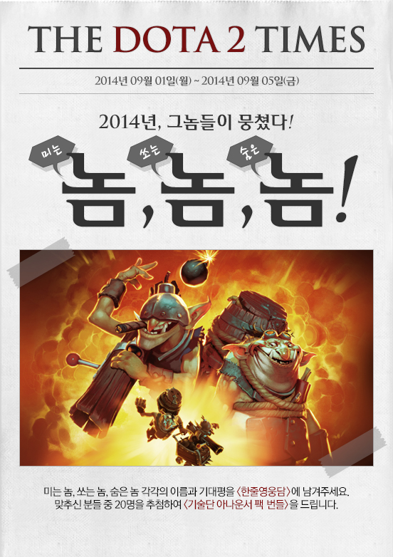 도타2가 이번에 미는놈 쏘는놈 숨은놈 이벤트를 진행한다고 합니다.이번 출시 예정인 기술단은 다른 영웅과는 다른 특이하게 3인조로 구성이 되어있는 독특한 영웅입니다.각각의 이름과 함께 기술단의 기대평을 한줄영웅담에 남기시면 경품이 지급된다고 합니다.자세한 내용은 공식 홈페이지 이벤트페이지를 참조하시기 바랍니다.[이벤트 페이지 바로가기]기술단 영웅을 보니 정말 미는놈 쏘는놈 숨는놈.. 이게 딱 들어맞는 케릭터네요 ㅎㅎ도타2 개발진은 어떤생각을 가지고 이런 영웅을 개발했을까여?ㅋ