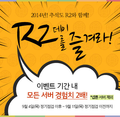 R2가 심심한 추석인사와 함께 추석이벤트를 한다고 합니다.이벤트는 오늘부터 9월 11일 일주일간 진행이 되며신규 특화 서버 넵튠은 벨런스를 위해 이벤트 대상에서 제외됬다고 합니다.그래도 넵튠서버 유저들은 맞춤서비스 정액제와 여러가지 이벤트를 제공받고있어그나마 다행인듯 하네요..이번 추석이벤트에서 제외된다고 해도 워낙 이벤트가 많아서 볼멘소리는 안나올듯 ㅋ와 벌써 광대찍은 유저가 나오다니..ㅎㄷㄷ하네요..이게 넵튠서버 클라슨가??