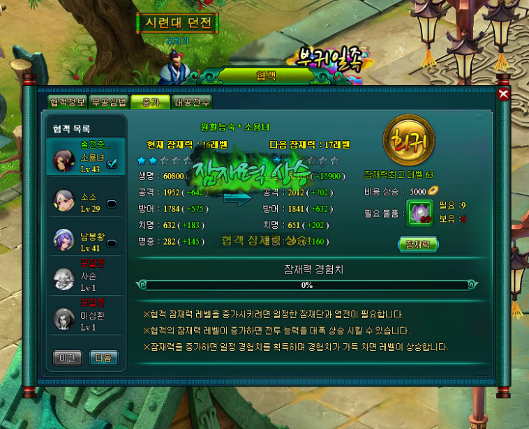 일파만파에서 협객이 있는건 아마 다 아실테고...실제로 본캐가 제일 중요하긴 하지만 협객 딜링도 무시 못합니다.그래서 협객 잠재력 상승으로 협객의 능력치를 올려주면 좋은데그때 잠재단이라는게 필요해여. 아마 금자로 사야되서 못사는 님들도있을텐데 보시면 금자 옆에 사례금이라는게 있음. 이걸로 하나당 2사례금만주면1개 구입가능하다는.ㅋㅋ 잠재력 1업마다 능력치가 꽤나 많이 올라서 좋아여.