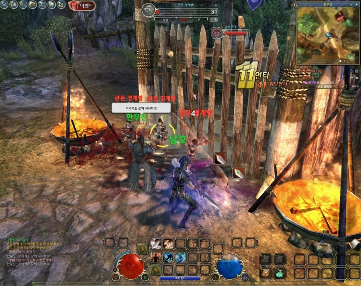 사실 열혈강호2의 산채를 소탕하고 세상박의 나쁜세력들을 처단할려했는데 저앞의 NPC들만 홀연히문을 뚫고 지나가서 다음을 기약했는데 이번에 오픈베타할때는 사이좋게 문을 부수고 나가서 무림의 음모를 파헤치는 첫걸음이 상쾌해졌습니다 하하하 아직 무림초행이라 몇가지 무공밖에 익히지 못하여 미숙한면이 많지만 그래도 마을주위에 있는 귀찮은몬스터들부터 하나둘 처리하고 있습니다. 최근엔 허공답보고 익혀서 걸어서 몇시간 걸리는 거리를몹들의 위협도 받지 않고 여유롭게 이동해서 생활의 편리함도 한몫더 하는것 같습니다.역시 스펙부터 갖추고 봐야 살만한 세상 인것 같습니다. &nb