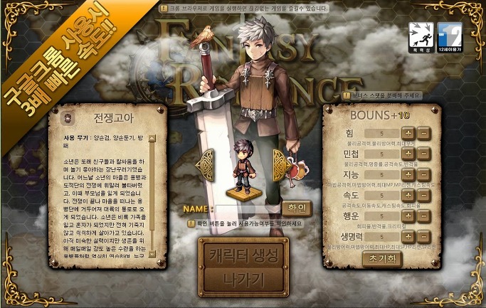 요즘엔 그냥 마우스클릭하고 자유롭게 전투위주의 커뮤니케이션 플레이만 하는게임이주류를 이뤘는데 판타지로망스를 드물에 예전 택틱스게임과 스토리 위주의 게임성으로출시가 되었더군요. 일단 전쟁고아랑 거지랑 4차원소녀 플롯이 존재하는데 개인적으로이런식의 게임은 캐릭터 별로 한번씩 다하구 싶어지네용... 지금은 4차원소녀 플레이니까 나중엔 거지캐릭을 한번 해봐야 겠습니다 ㅋㅋ