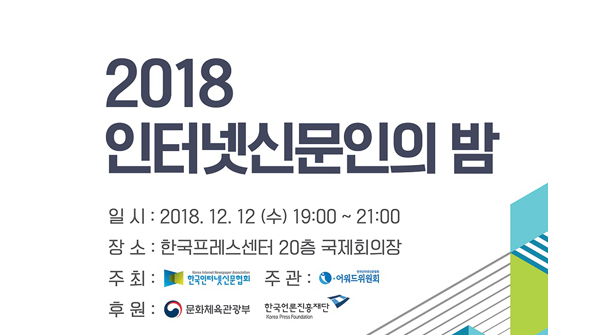 한국인터넷신문협회는 오는 12일 저녁 7시, 한국프레스센터 20층 국제회의장에서 2018 인터넷신문인의 밤을 연다. 인신협 산하 i-어워드위원회 주관으로 진행되는 '2018 인터넷신문인의 밤'은 인신협이 선정한 각 부문 '올해의 인물상'과 인터넷신문 발전에 기여한 '공로상' 시상이 진행된다2018.12.04 16:43 -