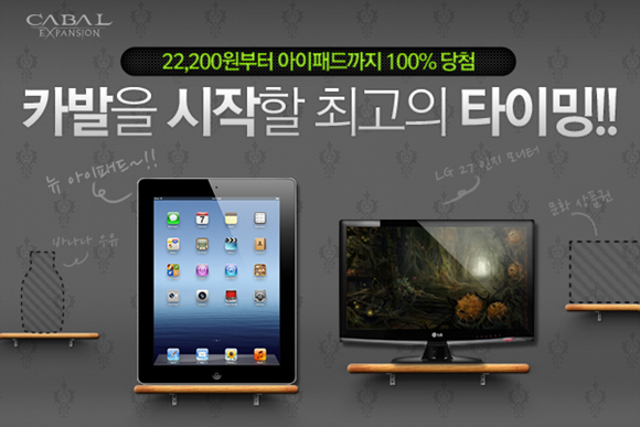또한 5월 30일부터 6월 27일까지 가입한 신규가입자가 20레벨 달성 시, 추첨을 통해 뉴 아이패드(16GB) Wi-Fi + 4G, 27인치 모니터, 문화상품권, 기프티콘 등의 푸짐한 경품을 제공하는 ‘카발에 도전하라! 하루에 한 시간만 투자하면 뉴 아이패드가 내 손안에!’ 이벤트를 동시 진행한다.