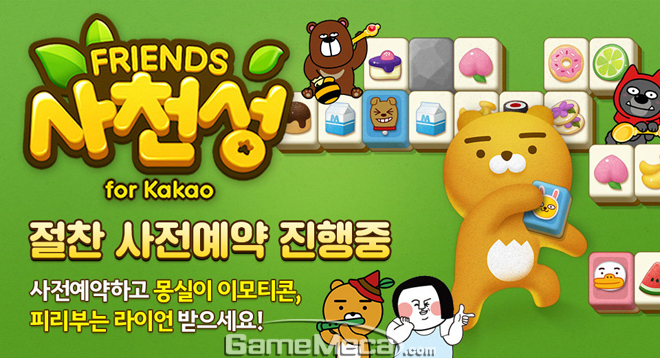 카카오는 10일, 카카오프렌즈 IP로 제작된 모바일 보드게임 '프렌즈사천성 for Kakao' 사전예약을 시작한다. '프렌즈사천성'은 카카오의 대표 캐릭터 '카카오프렌즈'가 등장하는 모바일 사천성 게임이다. 카카오가 직접 퍼블리싱하며, 개발은 국내 개발사 넵튠이 맡았다.
