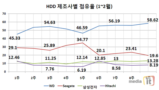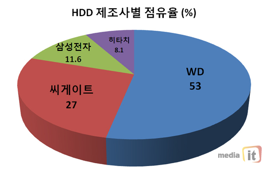 HDD 제조사별 점유율은 웨스턴디지털(WD)과 씨게이트, 삼성전자와 히타치의 4파전이 전개되고 있다. 이 업체들 외에 도시바와 HP 등의 업체들이 작으나마 판매가 이루어지고 있었지만, 수량이 극히 미미한만큼 데이터에서 제외시켰다.