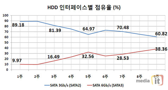- HDD 인터페이스별 점유율 : SATA 6Gb/s (SATA3) 인터페이스가 대세