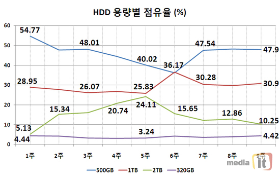 현재 1TB 제품의 가격이 6만원 대, 500GB 제품의 가격이 4만원 대로 1GB 당 가격에 있어서는 1TB 제품을 구입하는 것이 상대적으로 더 이득이라 할 수 있지만, 역시 절대적인 가격면에서 500GB 제품의 아성을 뛰어넘기 힘들었던 것으로 보인다. 2TB 대용량 HDD의 판매량도 한때 크게 상승하는 모습을 보였지만, 이후 계속해서 떨어지면서 10%대의 저조한 판매량으로 2월을 마감했다.
