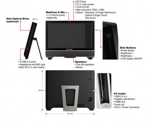 (1920×1080) 해상도와 16:9 Full HD를 지원하는 22"형 와이드 LED 패널 모니터 형태를 하고 있으며 외관상으로 보기에는 일반 LED 모니터 같지만 모니터 안에 시스템 본체가 내장된 인텔의 AIO 시스템 표준 사양을 준수해 설계 됐다.