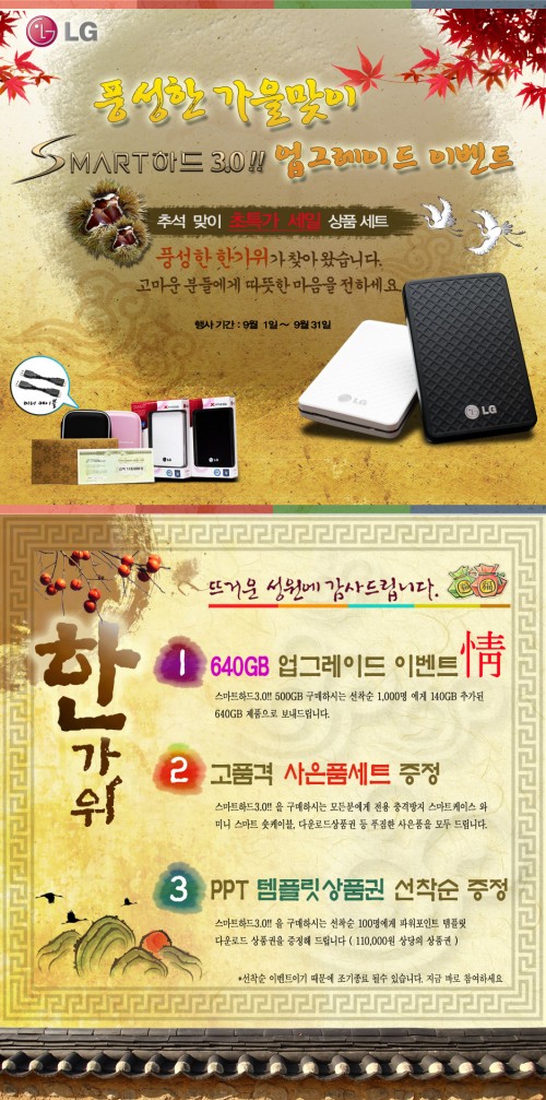 이번 情(정) 행사는 3가지로 진행될 예정. 첫 번째로, 640GB 업그레이드 이벤트는 스마트하드 3.0!! 500GB를 구매하는 고객 중 선착순 1,000명을 대상, 140GB 추가된 640GB 제품으로 발송할 예정이며,