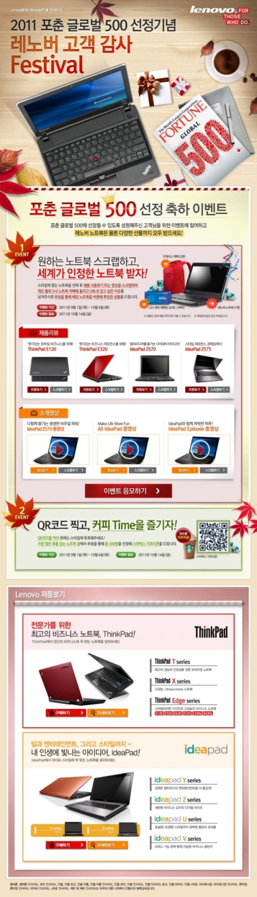 한국레노버는 최근 미국 경제전문지 포춘의 2011년 글로벌 500대 기업에 선정되는 등 괄목할 만한 성장을 달성한 것을 기념하며 가을맞이 고객 감사 이벤트를 진행한다. 9월 1일부터 10월 4일까지 진행되는 이번 행사를 통해 레노버 씽크패드 Edge E120 및 E320제품과 아이디어패드 Z570 및 Z575 제품을 포함한 아이디어패드 제품군의 제품 사용후기나 영상을 블로그나 카페에 스크랩하여 이벤트에 응모한 고객을 대상으로, 추첨을 통해 레노버 노트북, 백팩, 영화 예매권 등 다양한 경품을 제공한다.