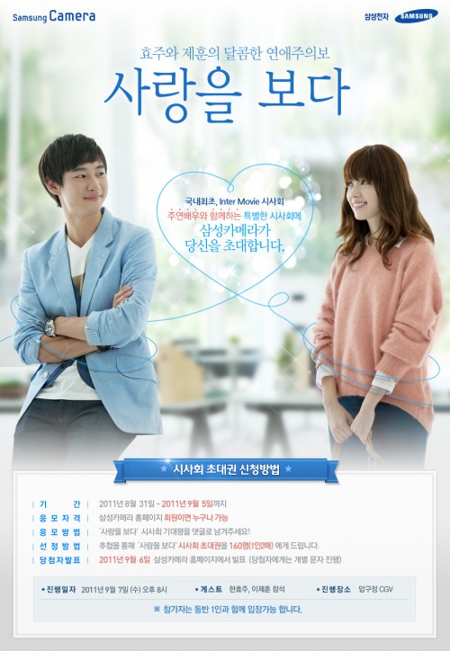 사랑을 보다 인터무비 시사회는 삼성카메라 홈페이지 회원이면 누구나 응모 가능하며 참여를 원하는 사람은 삼성카메라 홈페이지 (www.samsungimaging.co.kr)의 해당 이벤트 페이지 내에 사랑을 보다 시사회에 관한 기대평을 댓글로 남기면 자동 응모 된다.