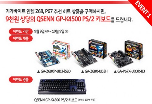 히트상품 컬렉션 이벤트는 용산 쇼핑몰(컴퓨존, 아이코다, 조이젠, 이지가이드, 피씨포올, 해커쇼핑몰, 아이클럽, 아이티앤조이)을 통해 지난 9일부터 10월9일까지 진행되며 기가바이트 Z68, P67 대표모델인 GA-Z68XP-UD3-iSSD, GA-Z68X-UD3H, GA-P67X-UD3R-B3 메인보드를 구매하는 모든 분들께 9000원 상당의 QSENN GP-K4500 PS/2 키보드를 증정(각 쇼핑몰별 한정 수량)한다.