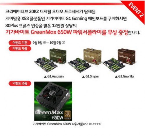 또 크리에이티브 20K2 디지털 오디오 프로세서 및 게임 전용 Killer E2100 네트워크 카드가 장착된 기가바이트 G1 게이밍 X58 메인보드를 구매하는 모든 분께 80Plus 브론즈 인증을 받은 12만원 상당의 기가바이트 GreenMax 650W 파워 서플라이를 1:1 무상으로 증정하는 이벤트다.