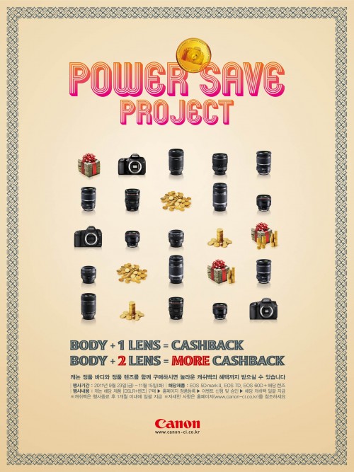 ‘파워 세이브 프로젝트’는 행사 기간 내에 캐논의 DSLR 바디 3종 (▲EOD 5D Mark II ▲EOS 7D ▲EOS 60D) 중 1개 제품을 구입한 소비자가 추가로 렌즈 21종, 스피드라이트 2종 중 1대의 제품을 구입하면 최저 7만원에서 최대 30만원까지 현금으로 돌려주는 이벤트다.