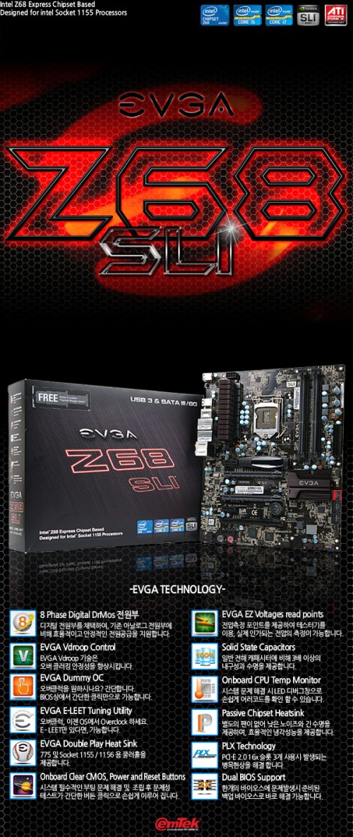 이엠텍아이엔씨(대표 이덕수 www.emtekinc.com)는 Z68 칩셋 메인보드 ‘EVGA Z68 SLI’를 선보이며 본격적으로 국내에 EVGA 메인보드를 유통한다.