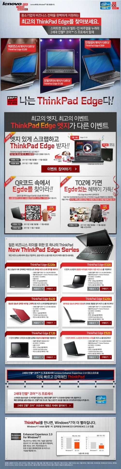 한국레노버는 지난해 초 국내에 출시된 이래 꾸준한 호응을 얻고 있는 씽크패드 Edge 의 고객 감사 이벤트를 11월 4일까지 진행.   씽크패드 Edge 제품의 영상을 블로그나 카페에 스크랩해 이벤트에 응모한 고객을 대상으로 추첨을 통해 11인치급 씽크패드 Edge 노트북과 카드 지갑, 아이스크림 상품권 등을 제공하는 이벤트다.