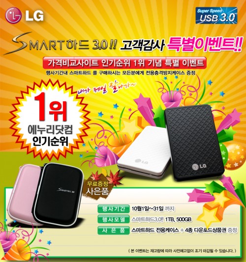 10월 한 달 간 스마트하드를 오픈마켓의 이벤트페이지를 통해 구매하는 모든 고객에게 약 6500원 상당의 스마트 파우치와 다운로드 상품권 4종을 무상으로 증정한다.