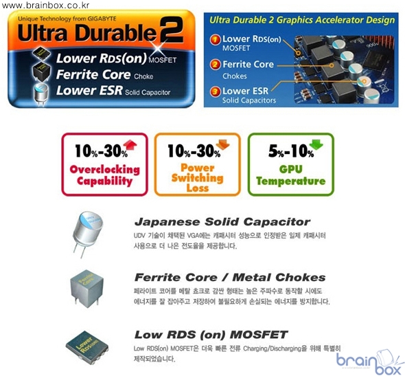 40nm 공정의 HD 6450 칩셋이 탑재된 GIGABYTE 라데온 HD 6450 UD2 Silent 0dB 제품은 Ultra Duarble2(이하:UD2) 설계기술로 디자인 되어 있으며 제품의 안정성을 보장하기 위해 내구성이 좋은 최고급 부품들을 채택하고 있다. 이 제품은 DirectX® 11.0 과 OpenGL 4.1을 정식 지원하고 64bit 대역폭의 DDR3 1GB 메모리를 탑재하여 AMD 하이브리드 Cross-Fire 시스템 구축에 최적인 제품으로 손꼽이고 있다.