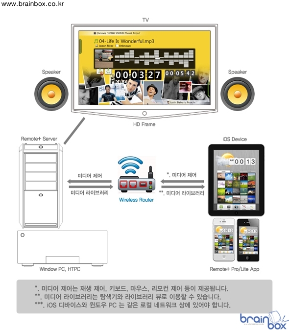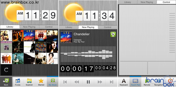 리모트+ 프로와 함께 제공되어 PC에 설치하는 리모트+ 서버 응용 프로그램은 시스템에 추가 및 삭제되는 미디어 파일을 자동으로 검색, 빠른 속도로 라이브러리화하여 사용자의 미디어 데이터베이스를 구축한다. |