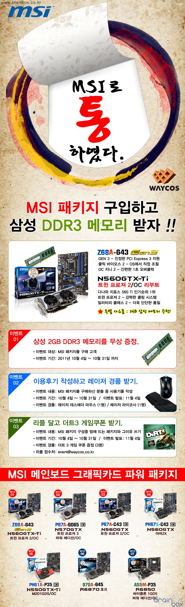 ● MSI ‘통 하였다’ 패키지 상품 이벤트 안내 - 행사진행 : 컴퓨존 컴퓨터 쇼핑몰 (www.compuzone.co.kr) - 행사기간 : 2011년 10월 6일 ~ 10월31일까지 - 행사내용 : I. MSI 패키지 전 구매고객 삼성 2GB DDR3 메모리 증정 이벤트. - 제품구매 : www.compuzone.co.kr/newevent/eventzone_view.htm?EventNo=716 MSI 공식 한국 디스트리뷰터인 ㈜웨이코스가 국내에 유통하는 MSI 메인보드 및 VGA는 타사 저가형 제품과 차별화된 3년 무상 A/S를 제공하며, 제품에 대한 더욱 자세한 내용은 웨이코스 홈페이지 (http://www.waycos.co.kr / 02-712-8999)을 참조하면 된다.