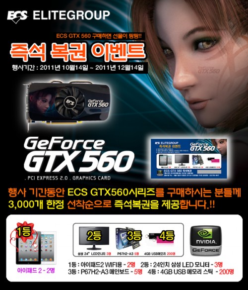 엘리트그룹컴퓨터시스템스코리아(한국지사장 박학선 www.ecs-korea.com, 이하 ECS)는 자사의 ‘ECS 지포스 GTX 560’ 그래픽카드를 구매하면 즉석 복권을 증정하는 이벤트를 실시한다.
