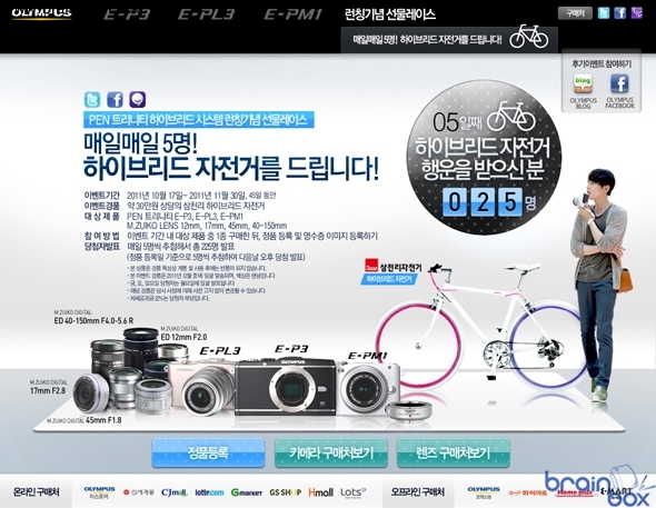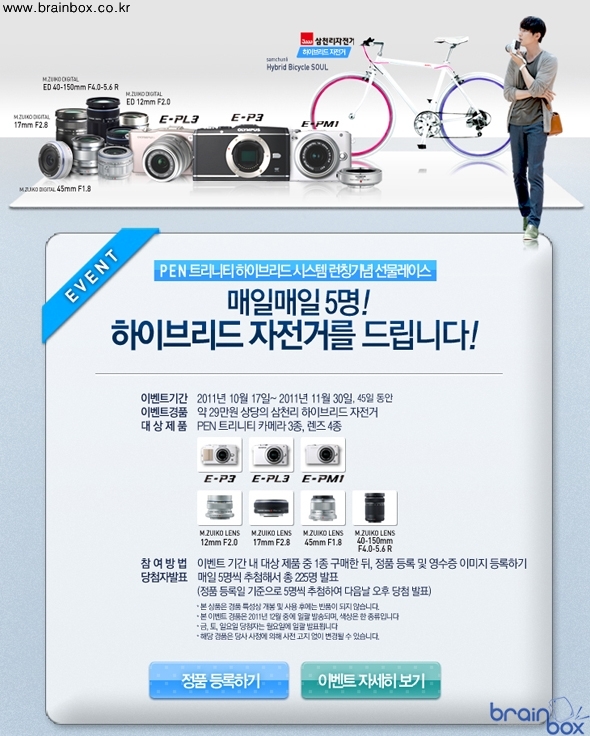 (2011년 10월 18일, 서울) 올림푸스한국 (대표: 방일석, www.olympus.co.kr)이 하이브리드 대표 카메라 PEN 3종과 렌즈 라인업 런칭을 기념해, 오는 11월 30일까지 45일간, 매일 5명에게 하이브리드 자전거를 증정하는 특별 이벤트를 진행한다.