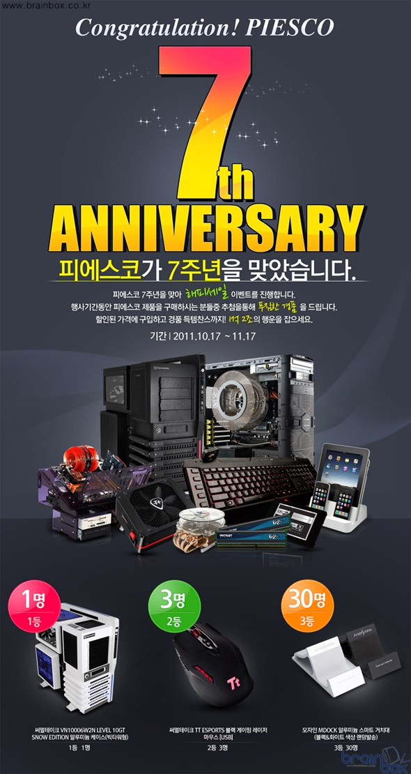 피에스코 창사 7주년 기념 이벤트는 자사 최신 인기 제품을 한정수량 저렴하게 구입할 수 있는 특별 할인전과 구매 고객중 총 34분을 추첨하여 30만원상당의 최고급 PC 케이스 및 게이밍 마우스, 스마트폰 거치대를 경품으로 내세운 득템 찬스, SSD 선착순 구매 50분에 한하여 8GB 용량의 OCZ 정품 USB메모리 증정 등 다채로운 이벤트를 마련했다. 특히, 이번 이벤트에는 현재 국내외에서 인기리에 판매중인 "OCZ(www.ocztechnology.com)" SSD(Solid State Drive)를 비롯 하여, 정통의 하이엔드 PC브랜드인 "써멀테이크(www.thermaltake.com)", 키보드, 마우스, 헤드셋등 국내출시를 통해 주목을 받고 있는 "Tt eSPORTS(www.ttesports.com), 국내 유일의 아크릴 케이스 "투렉스(www.turex.co.kr)’ 등 피에스코에서 유통하는 9개의 브랜드가 총망라된다.