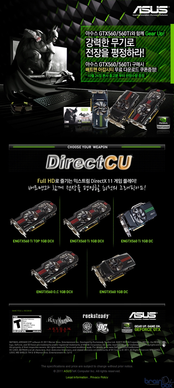 ASUStek사의 국내유통사인 에스티컴퓨터(http://www.stcom.co.kr , 대표 서희문)는 아수스 Geforce GTX560, GTX560Ti 그래픽카드를 구입하면 "배트맨 : 아캄시티" 게임 무료 다운로드 쿠폰을 증정하는 이벤트를 진행한다.