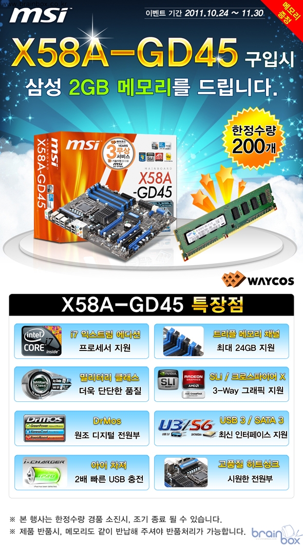 인텔 X58 칩셋 기반에 Core i7 Extreme Edition 프로세서를 지원하는 최상의 MSI X58A-GD45 구매 고객에게 삼성 DDR3 2GB 메모리를 무상 증정하는 행사를 실시한다. 주요 온라인 컴퓨터 쇼핑몰에서도 구매가 가능하며 200