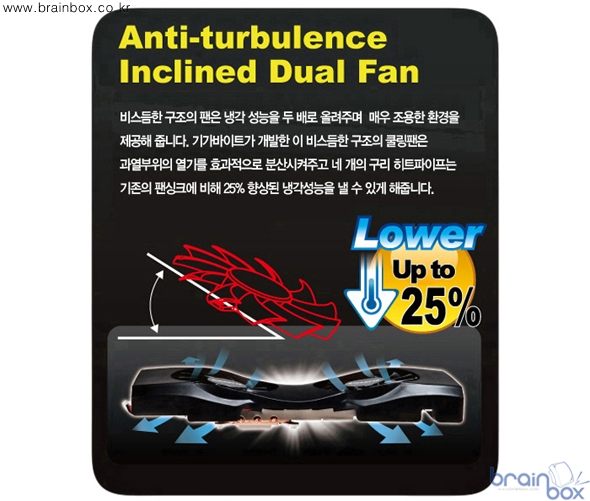 이 제품의 또 다른 특징은 미러링 방식의 WINDFORCE-2X 쿨링팬을 탑재하였다는 점이다. 공기역학을 최대한 이용한 저소음 PWM 80mm Dual cooling-fan과 Direct Touch 히트파이프 설계는 기존 레퍼런스 쿨러가 장착된 제품과 비교하여 약 +25%이상 향상된 냉각 성능을 제공하고 있다. 금도금으로 마감된 HDMI-2X포트 및 각 출력포트의 먼지유입 방지캡 적용 또한 제품의 높은 완성도를 보여 주고 있다.