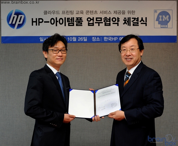 한국HP (대표: 함기호 /www.hp.co.kr)는 서울 여의도동 HP 본사에서 프린트 학습지 전문업체인 ㈜아이템풀 (대표: 류덕환 /www.anyschool.co.kr)과 클라우드 프린팅을 통한 학습 콘텐츠 제공 서비스 협업을 위한 업무협약식 (MOU)을 체결했다고 밝혔다.