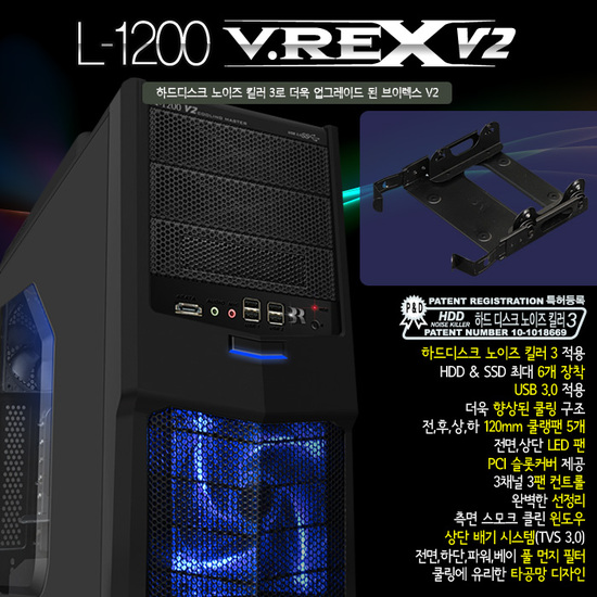 'L-1200 브이렉스'는 하드의 진동 및 소음을 방지하기 위한 하드디스크 노이즈 킬러 3를 장착한 제품으로 하단 파워 장착 방식을 채용했다. 상단 배기 시스템(TVS 3.0)의 Blue LED 120mm 듀얼 쿨링팬 및 후면 120mm 쿨링팬을 이용해 열을 효과적으로 배출하며, 상단 배기 시스템(TVS 3.0)에는 USB 3.0 포트를 두개 달아 활용도를 높였다.