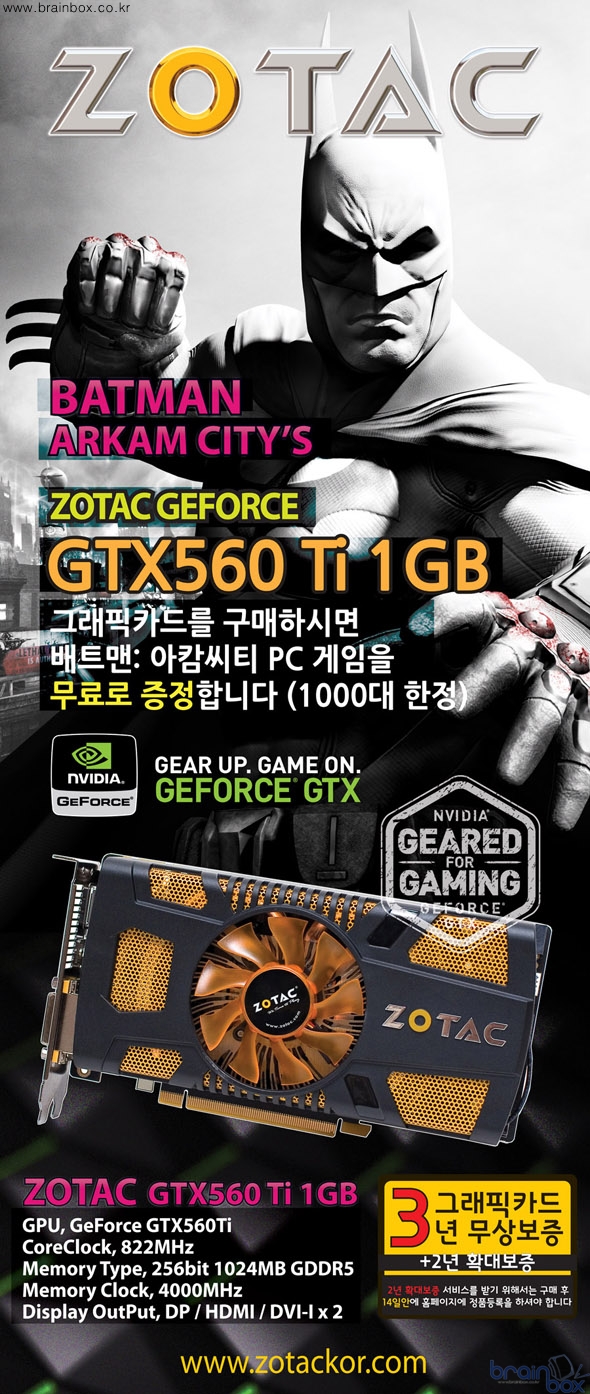 조텍 GeForce GTX560 시리즈 구매시 , 배트맨 : 아캄시티 다운로드 쿠폰 증정. 그래픽카드와 메인보드, 미니PC의 세계적인 선도업체인 조텍 (대표이사 김성표)에서는 자사의 GeForce GTX560 과 GTX560 Ti 구매자를 대상으로 “배트맨 : 아캄시티” 를 다운로드 할 수 있는 쿠폰 증정 행사를 가진다고 밝혔다. Game of the year에 빛나는 전작 “배트맨 : 아캄어사일럼” 의 후속인 “배트맨 : 아캄시티” 는 이미 발매전부터 유저들의 관심을 한 몸에 받고 있는 2011년 하반기 최대 기대작중 하나로 해외에서 49.99달러(약 57,000원)에 예약이 진행중인 게임이다. 전작 “배트맨 : 아캄어사일럼” 을 플레이 해 본 게임유저들은 “배트맨 : 아캄시티” 의 발매를 손꼽아 기다리는 하반기 최고의 게임이라 할 수 있다.