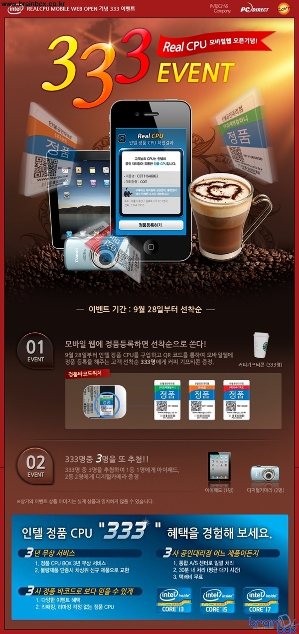 9월 28일부터 진행되고 있는 인텔 정품 CPU 333 이벤트는 인텔 정품 프로세서를 구매하고, QR코드를 이용해 모바일 웹을 통해 정품 등록을 하는 소비자를 대상으로 한다. 해당 이벤트는 선착순 333명에게 커피 기프트콘을 선물하고, 이 중 3명을 다시 추첨해 디지털카메라, 아이패드 등의 경품을 제공하는 행사이다. 인텔 프로세서를 구입하고 변경된 QR 코드를 확인만 하는 것이 아니라 실제 정품 등록을 통해 여러 이벤트 혜택을 받을 수 있다. 본 행사는 조만간 선착순 마감을 통해 마무리 될 예정이라고 하니 정품 프로세서를 구입한 이들이라면 한번 쯤 참여 해보는 것도 좋을 것이다.