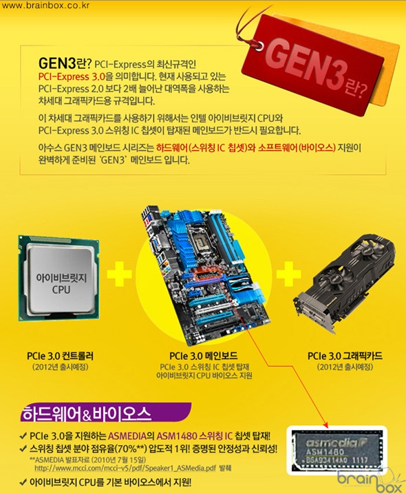 PCIe 3.0을 사용하기 위해서는 인텔의 차세대 22nm 아이비브릿지 CPU와 스위칭IC칩이 탑재된 메인보드가 필요하다. 아수스 GEN3 메인보드 시리즈는 차세대 PCIe 3.0 규격 지원을 위해 PCIe 3.0 스위칭 칩셋인 ASM1480 칩셋을 장착해 하드웨어적으로 완벽하게 준비를 마쳤으며, 인텔의 아이비브릿지 CPU 지원 바이오스도 이미 업데이트되어 완전무결하게 지원 준비를 마친 "완성형" GEN3 메인보드다.