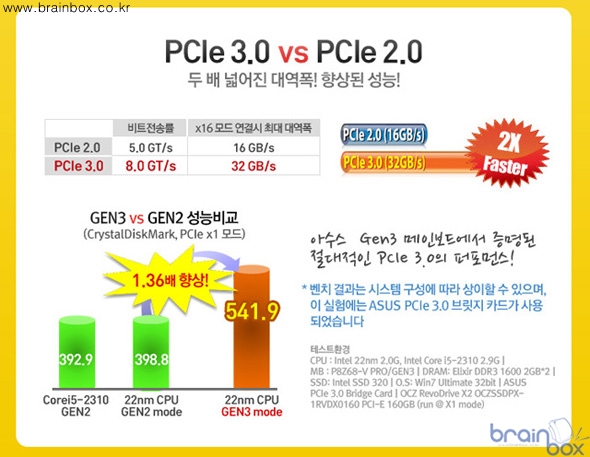 아수스의 테스트 결과를 보면 현재 PCIe 3.0은 Pcie 2.0에 비해 현재 약 1.4배에 이르는 성능향상을 보여주고 있다. 향후 바이오스 업데이트 및 앞으로 출시될 PCIe 3.0을 지원하는 고성능 장치들을 통해 PCIe 3.0의 성능은 더욱 발전될 전망이다.