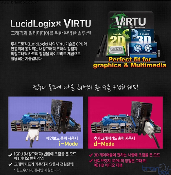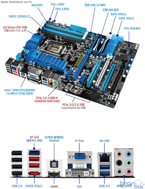 ASUS P8Z68 -V GEN3 제품은 풍부한 하드웨어 구성을 갖췄다. SLI와 CrossFire 모두 지원하는 총 2개의 PCIe 3.0 슬롯이 장착되어 있으며 인텔 기가비트 랜, 8채널 오디오, eSATA, USB 3.0, BT GO 블루투스 등 풍부한 확장성을 제공한다. 루시드로직(Lucidlogic) 사의 Virtu 기술은 CPU와 연동되어 동작되는 내장 그래픽코어의 장점과 외장그래픽 카드의 장점을 하이브리드 개념으로 활용, 전체적인 그래픽 성능을 최적화해 주는 기술이다. 동영상 변환 등 내장그래픽코어가 더 효과적인 특정작업의 경우 최대 3배 더 빠른 변환속도를 보여주는 등 내장과 외장 그래픽카드의 장점을 극대화 시켜준다.