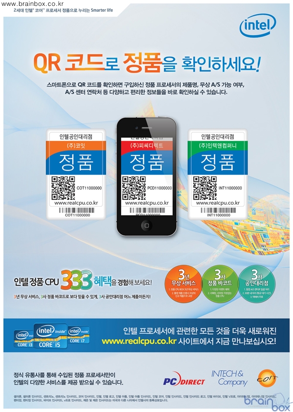 "QR 코드로 정품을 확인하세요!" 라는 문구를 통해 포스터를 말하고자 하는 내용을 손쉽게 확인할 수 있다. 기존에 진행했던 QR 코드 이벤트와 같이 정품 CPU를 구입하고 박스에 부착되어 있는 QR 코드를 스마트폰을 이용해 정품 등록을 할 수 있다. 정품 등록 시 구입한 CPU의 모델명과 무상 A/S 가능 여부, A/S 연락처를 손쉽게 확인할 수 있고, 추후 새로운 CPU가 나오는 신제품 정보를 이메일을 통해 제공할 예정이라고 한다. 또한 포스터에서 언급되어 있듯이 333 혜택은 인텔 정품 유저에게 3년 무상 서비스, 3사 정품 인증, 3사 공인대리점 서비스 등의 혜택을 기본적으로 제공한다. 더불어 지속적인 이벤트를 통해 정품 사용자들에게 보다 많은 혜택을 제공할 예정이라고 한다. 정품 CPU 확인이 중요한 이유는 벌크 제품이나 정식 유통 제품이 아닌 가품을 손쉽게 QR 코드 하나로 확인할 수 있다. 정품 CPU는 A/S 기간을 3년 보장하며, 인텔 통합 A/S 센터를 통해 일괄적으로 서비스를 받을 수 있다. 또한 직접 방문 시 서비스 대기 기간을 30분 이내로 처리가 되며, 번호표 방식을 도입해 서비스 시 줄을 설 필요가 없어졌다. QR코드의 QR은 ‘Quick Response’의 약자로 스마트폰에서 어플을 통해 찍어 입력을 하면 앱을 통해 곧장 QR코드가 의미하는 인터넷 페이지로 바로 연결이 된다. QR 코드는 인텔 정품 유저를 위한 시스템으로 다양한 경품 이벤트와 다양한 서비스들이 가능하다. 인텔 정품 확인 서비스 및 QR 코드에 관한 것은 인텔 공인 대리점 3사가 운영하는 리얼 CPU(www.realcpu.co.kr)를 통해 확인할 수 있다, |
