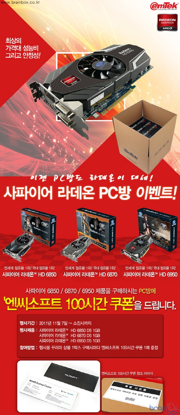 2011년 12월까지 진행되는 이 행사는 국내는 물론 전 세계 시장 점유율 1위의 명성이 빛나는 라데온의 절대 강자인 사파이어의 HD 6850, HD 6870, HD 6950 그래픽카드 3종으로 진행되며 국내 공식 유통사인 (주)이엠텍아이엔씨는 이번 행사를 위해 5개의 그래픽카드와 무료 이용쿠폰이 같이 들어있는 PC방용 꾸러미 상품을 별도로 제작해 판매를 시작한다.
