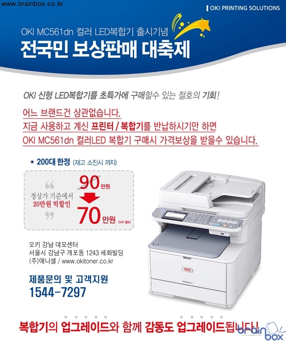 오키의 강남 데모센터에서는 개인용 프린터에서부터 기업, 전문가용 프린터 및 복합기 등, 오키 제품의 풀라인업(Full Line-up)이 전시되며, 1:1 제품 시연을 통해 방문객이 직접 오키 LED 프린터와 복합기 제품을 체험해 볼 수 있다. 뿐만 아니라, 명함재단기, 열전사프린팅, 아노토펜 솔루션 등 오키 프린터와 함께 사용할 수 있는 다양한 관련 솔루션을 제공하여, 특히 전문가 사용자들의 편의를 강화했다. 한편, 오키는 이번 강남 솔루션 데모센터 개관과 더불어 2011년형 A4 LED 컬러복합기 신제품인 MC561dn 출시 기념, ‘전국민 보상판매 대축제’ 이벤트를 진행한다. 기존에 사용하던 구형 프린터 및 복합기 제품의 반납시, 브랜드에 관계 없이 20만원을 할인(200대 한정)받을 수 있어, 복합기 구매를 고려하고 있는 소비자에게는 획기적인 기회다.