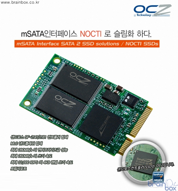 이번에 출시하는 녹티(NOCTI) 시리즈는 30x50x3.5mm 라는 초소형, 슬림형으로, 샌드포스사의 mSATA전용 컨트롤러인 SF-2141/2181 컨트롤러를 사용하였으며, 120GB 기준 순차읽기 최대 280MB/s, 순차쓰기 260MB/s의 성능과 동작시 소모되는 전력이 1.7와트에 불과할 정도로 에너지 절약 및 고성능을 제공한다. 녹티(NOCTI)시리즈는 30GB, 60GB, 128GB 세 종류의 용량으로 출시되며, 보증기간은 3년을 제공한다.