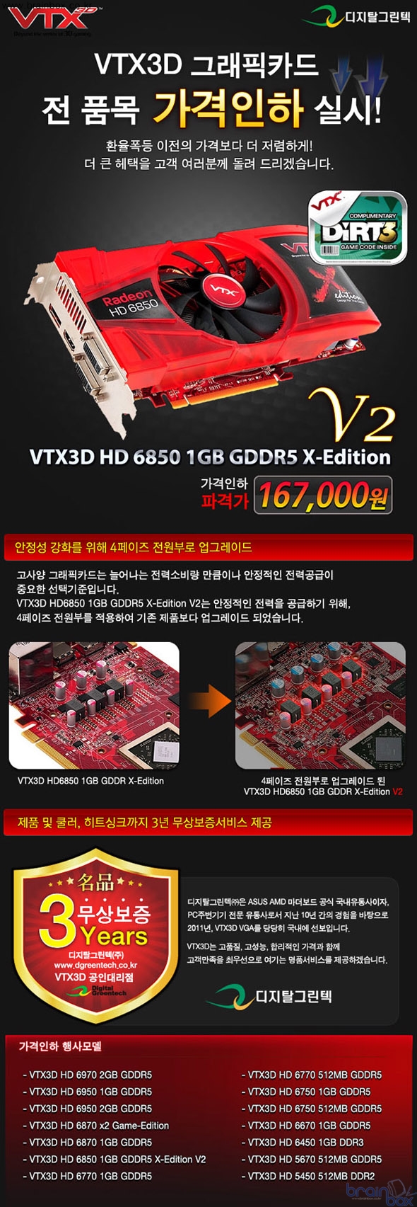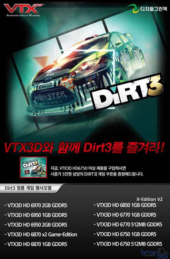 특히, 팩토리 오버클럭을 통해 성능을 향상시킨 [VTX3D HD6850 GDDR5 1GB X-Edition]은 쿨러 및 소모성 부품에 대해서도 3년 무상 보증서비스를 실시하면서도, 경쟁사 제품을 통틀어 유일하게 16만원의 파격적인 가격에 판매된다. 이처럼 [VTX3D HD6850 GDDR5 1GB X-Edition]은 경쟁사 제품을 압도하는 품질보증과 가격경쟁력을 무기로 AMD 라데온 대표 그래픽카드인 HD6850 시장에서 보다 유리한 고지를 선점할 것으로 보인다. 이 밖에도, 디지탈그린텍㈜은 전 품목 가격인하와 함께 HD6850 이상의 제품에 제공되던 더트3 게임쿠폰 증정 이벤트를 HD6750 이상으로 확대실시를 결정했다. 레이싱게임 개발의 명가 코드마스터가 지난 5월 출시한 [더트3]는 랠리레이싱이라는 독특한 게임성으로 전세계적으로 폭 넓은 인기를 누리는 게임으로, 꾸준히 레이싱게임 순위 1위에 오르며 그 저력을 확인시킨바 있다. DIrectX 11을 지원하는 AMD VGA에서 최고의 게임환경으로 즐길 수 있는 [더트3]는 지금까지도 온라인 게임 플랫폼 Steam에서 49.99달러에 판매중인 게임이다.