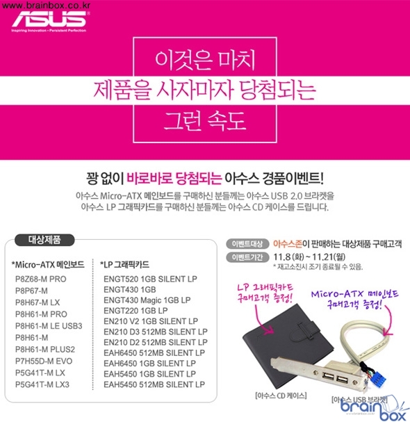 이벤트 대상 제품으로는 EAH6450 512MB SILENT LP, EN210 D3 512MB SILENT LP 등 그래픽카드 11종 P8H61-M PLUS2 등 메인보드 10종 이다. 그래픽카드를 구매하는 분에게는 아수스 CD케이스를 증정하며, 메인보드 구매자에게는 USB 브라켓을 증정한다.