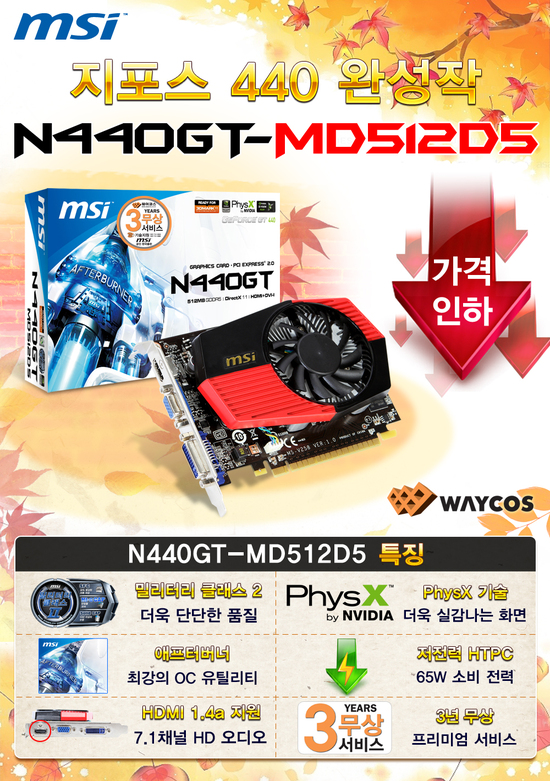 MSI의 국내 유통사 웨이코스(대표 고민종)는 지포스 보급형 그래픽카드 'MSI N440GT-MD512'의 가격을 인하한다.