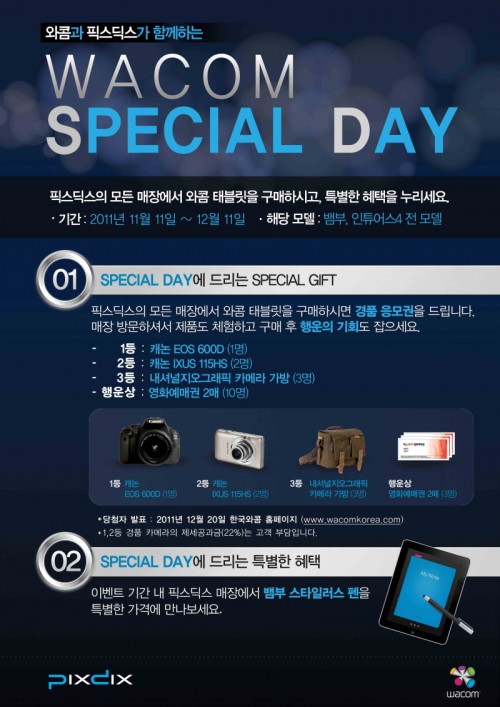멀티 브랜드 숍 픽스딕스 전국 매장에서 펼쳐지는 픽스딕스-와콤 스페셜데이 이벤트는 빼빼로 데이인 11월 11일부터 12월 11일까지 한 달 동안 진행된다. 행사 기간 동안 전국 픽스딕스 매장에서 와콤 펜 태블릿 인튜어스4와 뱀부 전 모델을 구매한 고객에게는 추첨을 통해 최고급 카메라 및 카메라 가방을 증정한다.